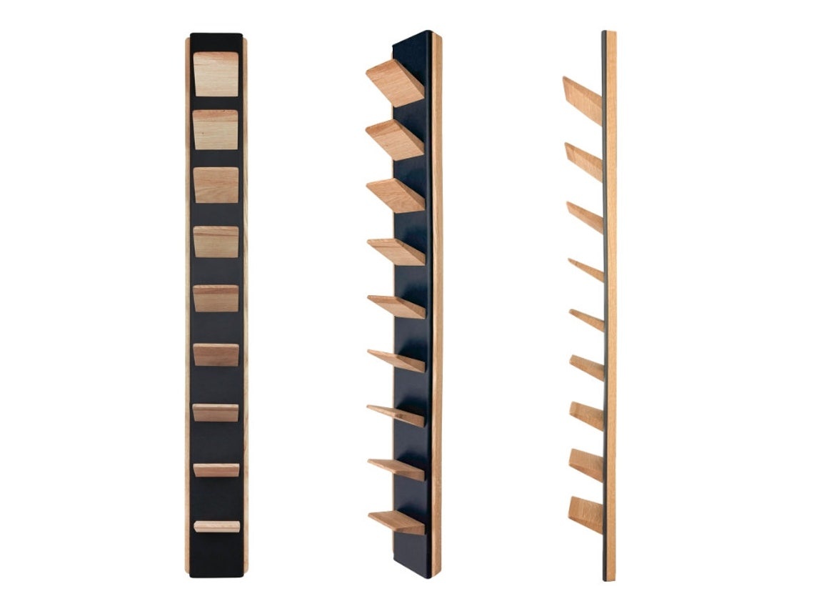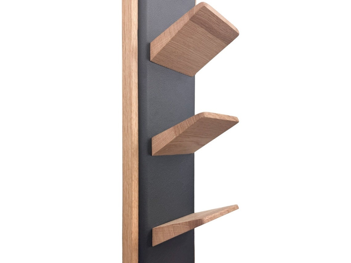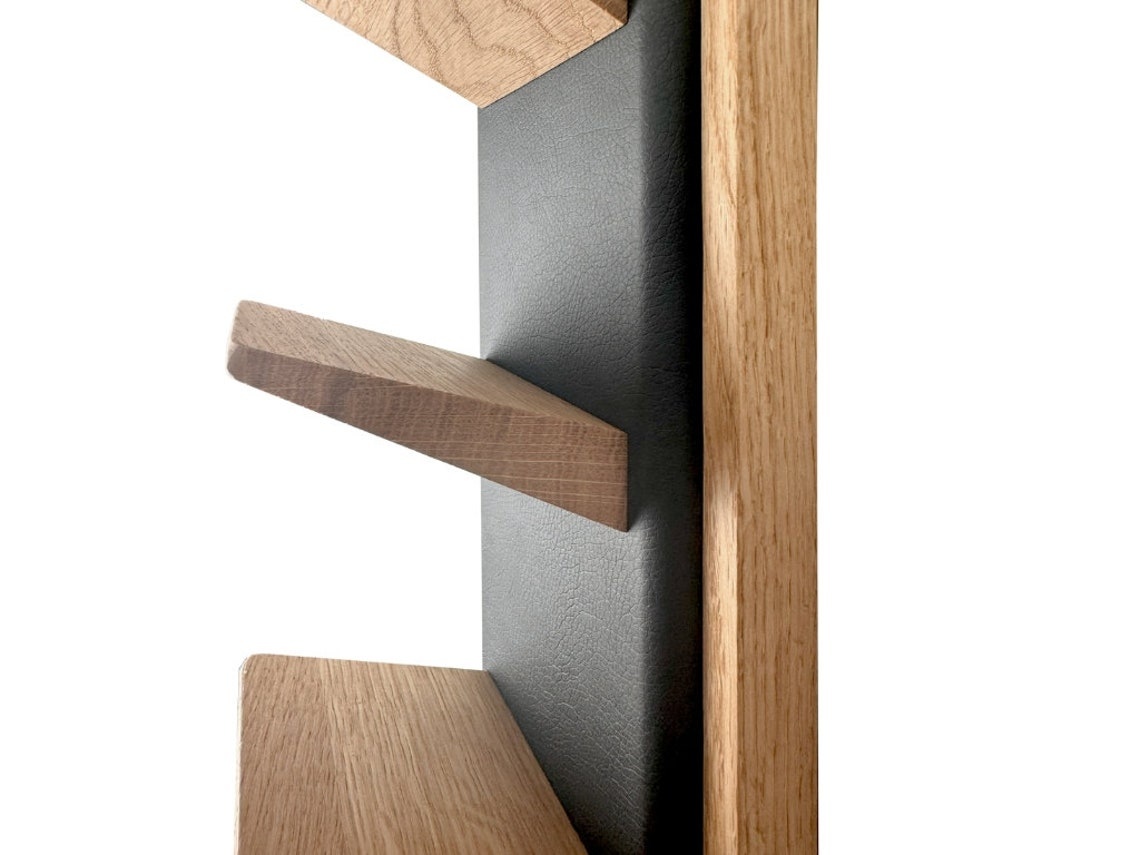 Das Regal wird aus hochwertigem Eichenholz oder Amerikanischem Nussbaum gefertigt und mit Öko-Leder-Akzenten veredelt.