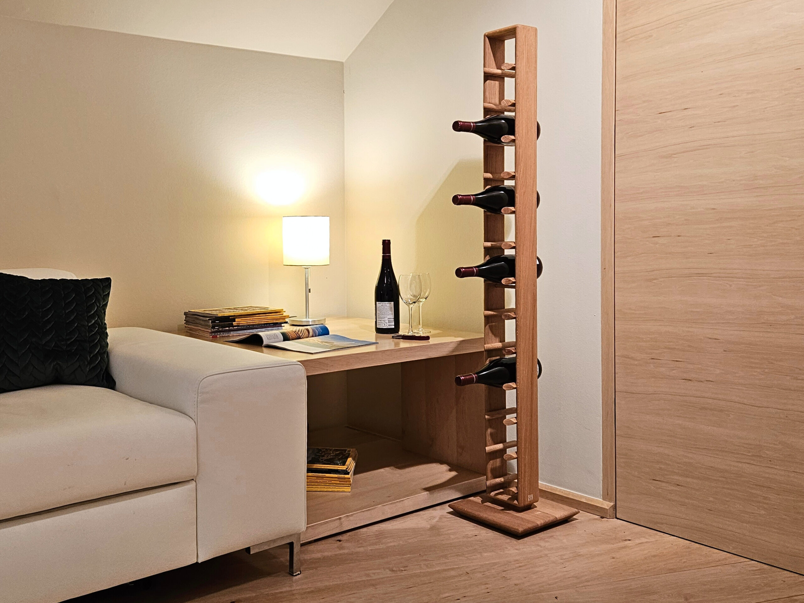 Das PIKE Weinregal aus Holz für 13 Flaschen inspiriert vom japanischen Minimalismus, bietet funktionales Design und ästhetische Schönheit.